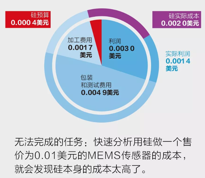 我们通过简单的数学题来阐释这一问题。(如果不想看,可直接跳至下一段。)如果1平方毫米的传感器的售价为0.01美元,那么制造商制造该传感器的成本不应超过0.007美元,因为大多数制造商希望在销售该传感器时至少能获得30%的利润率,即0.003美元的利润。根据当今制造传感器的经验法则,MEMS芯片的成本约为最终传感器成品成本的30%,其余70%的成本用于传感器的包装、测试、电子数据读出和校准。因此, MEMS芯片的成本就只能为0.007美元的30%,即约0.002美元。最后,硅材料大约占未包装MEMS芯片成本的20%。这留给传感器硅的预算仅为0.000 4美元。