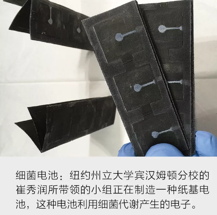 在纽约州立大学宾汉姆顿分校,崔秀润(Seokheun Choi)小组正在开发一种纸基电池,这种电池具有一种非传统的电子来源——细菌。可以在泥坑里找到某些细菌,在代谢食物时产生电子。这些细菌附着在印在纸上的金属电极上,金属电极收集排放出的电子。产生几微安培的电流需要一堆细菌电池,这通过折纸手工很容易实现——只需将纸多折叠几次。