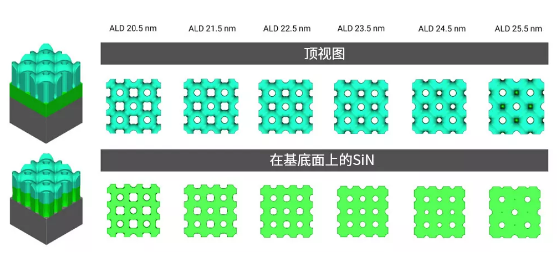 SEMulator3D中可以通过ALD厚度实验设计确定这一最佳厚度。该模拟的结果如图5所示,刻蚀自上而下的形状和底部横截面也可见。随着ALD厚度的增加,SiN /基底界面处的孔形状从方形变为圆形,并且逐渐变小。在足够的ALD厚度下,菱形孔的尖端可视度有限,这会导致较低的刻蚀速率且刻蚀保持圆形。在23.5nm的ALD厚度下得到了此次剖面SiO2和SiN刻蚀工艺最均匀的孔形状。