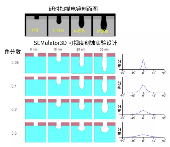 图3:模拟实验设计与延时SEM的比较。模拟实验设计使用了恒定刻蚀量和不同的角分散(高斯分布的标准差),进行模拟并显示增量材料删除步骤失效。右侧的直方图说明了角度分布与软件中数值设置的相关性(不按比例)。刻蚀工艺的实际角分散是通过找到与刻蚀轮廓最匹配的模拟实验设计结果来确定的。