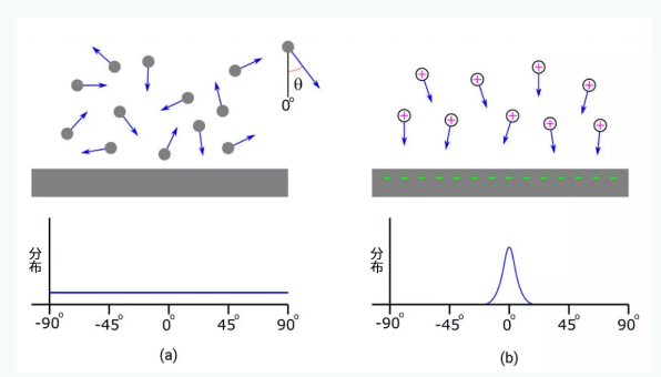 图1a:中性气体在腔室内随机流动的二维展示。气体的行进角度在图中描绘的所有方向上均等分布(图1a)。图1b:显示了带正电的离子和一个带负电的晶圆。离子会因电场而向下加速;然而,由于随机热效应和与其他离子或气体分子的碰撞,完美垂直轨迹无法实现。角速度分布可以近似为高斯函数(图1b)。