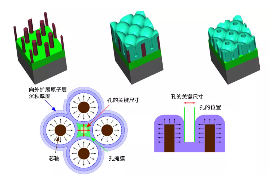 作为SEMulator3D中可视性刻蚀的示例,我们将使用剖面的二氧化硅 (SiO2)和氮化硅 (SiN) 刻蚀工艺模型来确定确保SADP柱孔关键尺寸的均匀性所需的最佳原子层沉积 (ALD) 厚度(见图4)。该样品由50nm SiN层和100nm高的碳芯轴组成,芯轴直径20nm,水平间距80nm。最终目标是使用SADP创建一个40nm间距的孔阵列。此剖面SiN / SiO2刻蚀的角分散为0.08,对所有异物的选择比为0.3。使用ALD形成的孔不对称形状呈现为带有圆形开口的菱形,与在芯轴上形成的圆柱形孔形成对比。由于此菱形孔的大小可以通过ALD进行调整,我们需要确定ALD的临界厚度,刻蚀过程中这一厚度的ALD下进入此菱形孔区域的离子总量与进入圆柱区域的离子总量相等,这将带来相等的刻蚀深度和形状。