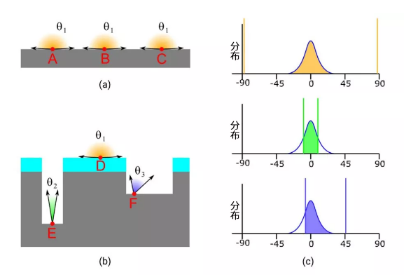 图2a:在平面晶圆表面,每个位置(A、B、C、D)完全暴露在腔室中(开口角为180°),并且接收各个方向的全部离子通量。图2b:在凹坑和沟槽(E、F)底部,腔室视线内的角度范围减小。刻蚀速率可以表示为角度范围内的分布积分(垂直线之间曲线下的阴影区域)。