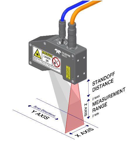 在典型的激光线轮廓仪中,激光线条被投射到物体上,并使用一个2D(区域/矩阵)图像传感器进行成像。在确定激光条纹在图像传感器上的位置后,轮廓仪会提供由激光条纹的光学三角测量产生的横向(X轴)和深度(Z轴)信息。沿着激光线生成的XZ对集称为轮廓。沿运动方向的两个连续轮廓之间的距离构成第三轴(Y)。通过这种方式扫描物体,我们获得了物体的表面扫描信息(X,Y,Z)。